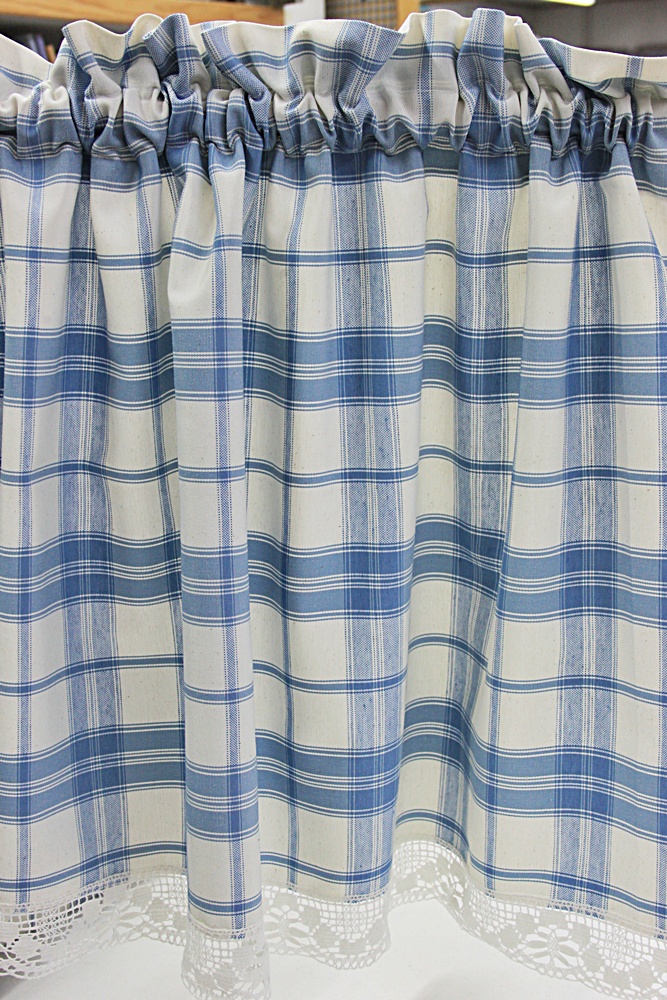 Med vacker spets ,botten offwhite med blå rutor, bomull |